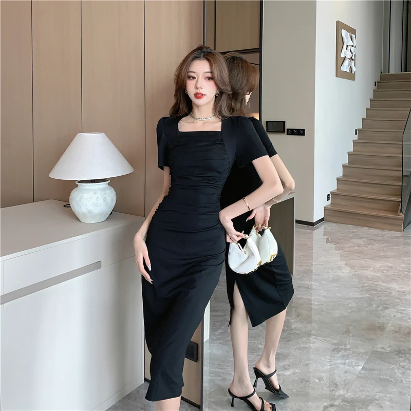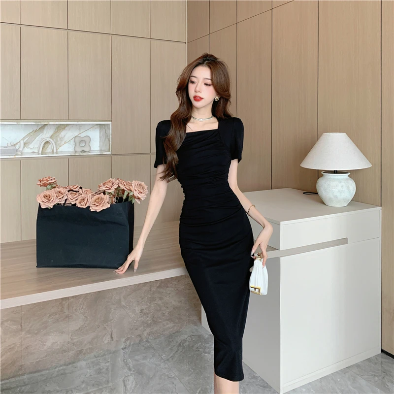 Summer Black Short Sleeve Square Collar Midi Dress Women Pleated Bodycon Home Dress 2025 Korean Vintage Hepburn Elegant Vestidos